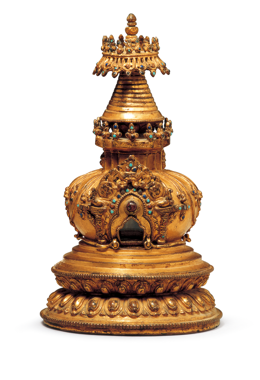 青海一些牧區(qū),天葬日凌晨,死者最小的兒子將尸體抱出帳蓬,人們把已經(jīng)捆好的尸體和一個(gè)裝滿(mǎn)土石的口袋連接起來(lái)搭在牛背上,或由天葬師背尸體到火葬場(chǎng),送葬者不能回頭、不能喧嘩、不能停步。到天葬臺(tái)后,除留一個(gè)非親屬的老人外,其余人全部撤離,然后天葬師將尸體肢解喂禿鷲。如果禿鷲將碎尸吃干凈,意味著死者生前行善積德,其靈魂已升天,如果禿鷲沒(méi)吃干凈,說(shuō)明死者生前有罪孽,家人要給寺院布施,請(qǐng)求寺院僧人再做法事,以贖死者罪惡,讓靈魂早日升天(圖為鎏金紫銅舍得塔)。