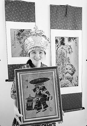一幅幅人物肖像、書法作品、風(fēng)景風(fēng)情畫,工藝精細(xì),造型典雅,誰能想到,它們出自一群苗家留守婦女之手?