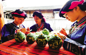 在貴州省天柱縣地湖鄉(xiāng)永光村,苗族姑娘們聚在一起學(xué)習(xí)蜜餞雕刻技術(shù),爭(zhēng)當(dāng)技藝傳承人。