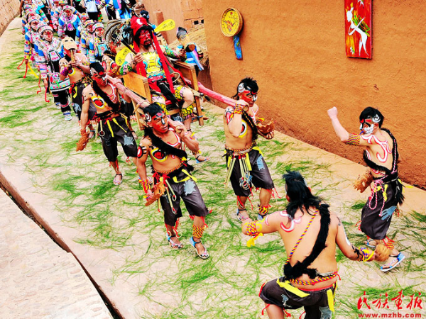 恭請大啞巴的儀式上,羅支全部到齊。羅支就是眾老啞巴,為首的被稱為畢摩。彩繪時,以不同的圖案分別繪在臉部的右上方作為家族和輩分區(qū)別。儀式上,六位畢摩在護(hù)衛(wèi)總管的護(hù)衛(wèi)下,依次點(diǎn)香叩首。畢摩大聲喊“請啞巴出山嘍”。然后四個壯實(shí)的中啞巴用扎好的彩轎抬著大啞巴游街,其余啞巴打歌跟在后面。最為活躍的是畢摩的跟幫,也稱為“馬彷”,他們以倒退的方式,邊跳邊引導(dǎo)行進(jìn)的隊(duì)伍。啞巴隊(duì)從村頭到村尾,通過祭拜龍樹、祭鼓,經(jīng)過“三請三唱三起號”,將大啞巴請到廣場,隨后開始了具有濃厚文化底蘊(yùn)的啞巴舞表演。