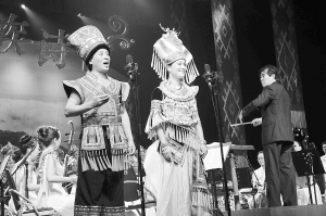 廣西戲劇院成立一年來,承擔(dān)起壯劇、桂劇、彩調(diào)劇3個(gè)國(guó)家級(jí)非物質(zhì)文化遺產(chǎn)劇目和京劇國(guó)粹藝術(shù)的傳承、保護(hù)、發(fā)展重任,不斷推出具有“美麗廣西、壯鄉(xiāng)風(fēng)格、時(shí)代特征、和諧兼容”的舞臺(tái)藝術(shù)精品,此次推出的《壯族詩(shī)情》便是其中之一?!秹炎逶?shī)情》共分“地鼓”、“天歌”、“水秀”、“山雄”4個(gè)章節(jié),以150多名演職員的演出陣容,通過合唱、獨(dú)唱以及民族器樂演奏的形式,如詩(shī)如畫地描述了廣西壯族的風(fēng)土人情,突出了“美麗廣西”時(shí)代主旋律。圖為《壯族詩(shī)情》演出現(xiàn)場(chǎng)。