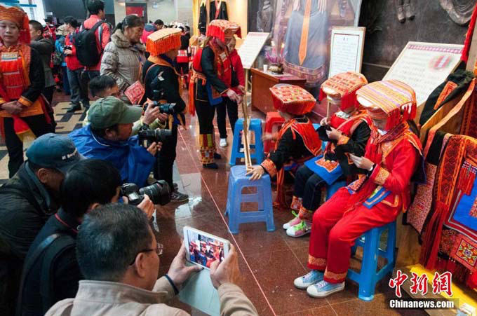 12月6日,在中國瑤族之鄉(xiāng)廣西金秀瑤族自治縣的盤王節(jié)上,當(dāng)?shù)乩弦惠叕幾鍕D女展示瑤族織繡