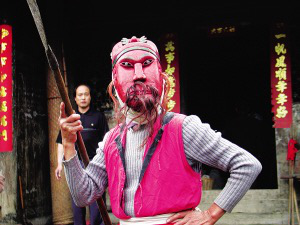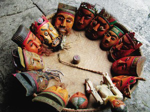 陽戲是一種原生態(tài)戲劇,其中道具的使用必不可少。主要包括服裝、面具、法器、樂器。面具在陽戲表演中占有突出的地位,是神靈的憑依和具象化。其面具有關(guān)圣帝、皇生、小生、老生、老丞相、元帥、老臣等共16面。在陽戲表演中,旦角(貴妃)是沒有面具的,搭帕子在頭上,身穿旦角服裝。面具為白楊木質(zhì)材料,精雕細琢,上面覆以濃重的彩繪。面具造型別致古樸,以頭冠和面相的特征區(qū)分角色,在藝術(shù)風(fēng)格上頗具地方特色。