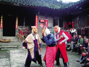 土家族陽戲在貴州、湖南、重慶等省、市都有流傳,湖南省張家界陽戲和重慶酉陽陽戲均被列入了省級非物質(zhì)文化遺產(chǎn)名錄,得到保護和重視。貴州沿河土家族自治縣的土家族陽戲同樣古樸而充滿風(fēng)韻,5月19日,當?shù)氐囊慌幕ぷ髡邤M通過挖掘整理,把獨具地方特色的面具陽戲申報為省級非物質(zhì)文化遺產(chǎn),希望沿河陽戲同樣受到重視和保護。