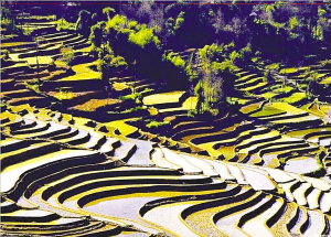 “萬丈梯田,直撲云天,仿佛一道道天梯……”這些經(jīng)典詞匯,一但當(dāng)人們贊美梯田時(shí),就會(huì)不厭其煩地用上它們:“細(xì)碎精巧的漣漪……精凈如鱗的波紋……金色的碎片綴滿山體……滿山流光溢彩……”但是,梯田的寧謐、靜美,是屬于前現(xiàn)代性的,當(dāng)現(xiàn)代性在山腳窺伺并最終漫上梯田社會(huì),一切都將發(fā)生改變。