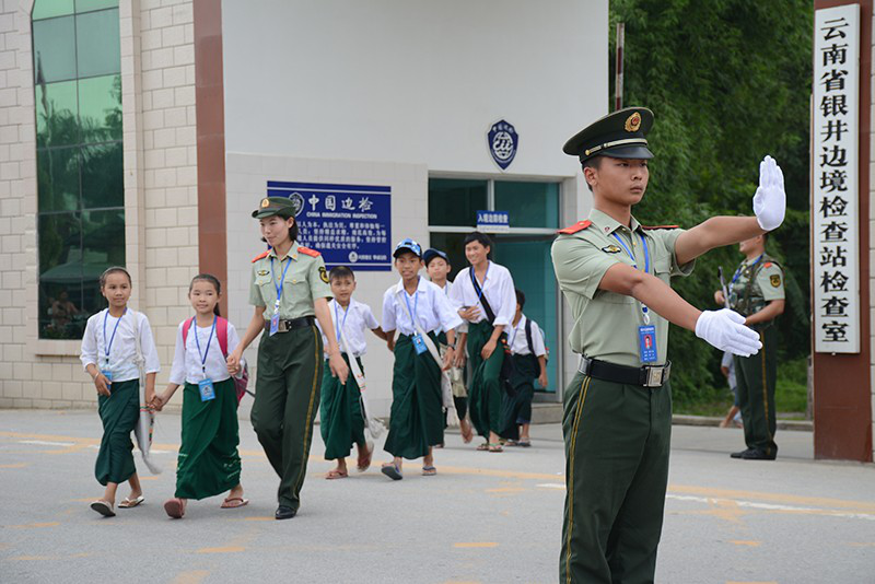 每天清晨,在這個熱鬧的邊境村寨里,都會看到這樣的景象:一群統(tǒng)一著裝的緬甸孩子騎著自行車來往于中緬國門之間,他們胸前掛著《出入境優(yōu)先候檢卡》,在邊防檢查站工作人員的護送下穿過馬路、去到學校。