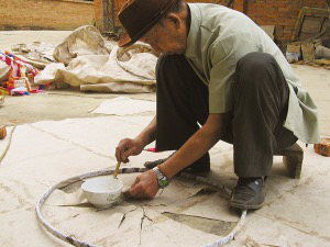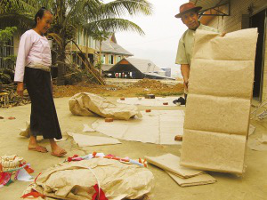 言談間,巖妞把制好的竹環(huán)放入早已畫好的同心圓圖案中的小圓上,只見竹環(huán)大小正好與小圓吻合。巖妞說,圖案外側(cè)的大圓便是擺放棉紙用的。接著,他把手中厚厚的幾張棉紙圍繞著已經(jīng)放入圖案中的竹環(huán)依次擺入,直至擺滿。在同心圓圖案的上側(cè),巖妞還畫了一個寬與同心圓圖案的直徑相符的矩形圖案,把棉紙鋪滿其中。巖妞說,這圖形就是“貢菲”的高度。制作的最后一道程序,是把棉紙用漿糊粘合起來。陰干后,一個“貢菲”就做好了。