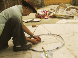 竹編主要用于制作孔明燈的骨架。首先將幾根竹子用刀削成寬約兩三厘米的竹條,然后將竹條彎成一個圈,兩端用繩子等物品捆牢,形成一個半徑約為25厘米的圓形竹環(huán),再在竹環(huán)周圍掛上彩布、彩紙等物。巖妞說,這樣就能在孔明燈底部形成一個通氣口,跟熱氣球的通氣口原理一樣。在孔明燈底部的通氣口安放上用牛油等混合物做成的燃料,燃燒所產(chǎn)生的熱氣流通過這個竹編制成的通道進入孔明燈內(nèi)部,等內(nèi)部充滿熱氣后,孔明燈就會向上飛。