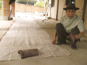 巖妞說,制作孔明燈最主要的材料是傣族的棉紙和竹編。棉紙來源于木棉樹。傣家人摘取木棉樹的樹葉并用牛油來煎熬,使之變?yōu)榘蛋咨臐{汁,待熬熟之后便拿到河邊沖洗,把其中的灰塵和沙粒洗凈。隨后,將洗凈的木棉樹漿汁攤均勻后在陽光下曝曬,曬干后便能拿來制作孔明燈了。一般的紙很容易被燒壞,而這種手工制作的棉紙韌性好,不容易撕裂和燒壞。