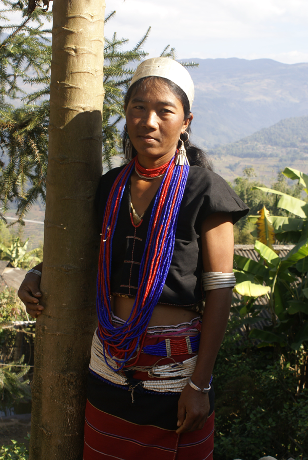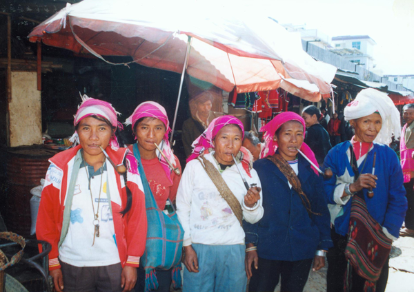 而婦女們的裝束特點分明與眾不同。最突出的是頭戴寬約3公分左右的銀箍,留長發(fā);身著靛青色無領(lǐng)大襟右衽及橫條花筒裙。腰系紅布寬腰帶和數(shù)十根細藤圈。耳掛垂肩圓形大耳環(huán),頸戴銀質(zhì)大項圈,細項鏈。上了年紀(jì)的人,喜歡戴長約五公分傘狀大耳筒,筒頂還刻有各種花紋。有的婦女在耳筒內(nèi)插上香花香草,有的放上人民幣,出門趕集,隨用隨取,很是便利(上下兩圖由劉軍供圖)。