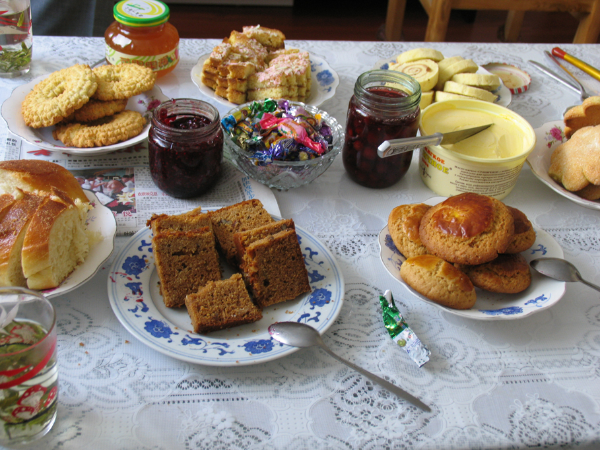 中國俄羅斯族的飲食文化既保留了傳統(tǒng)俄羅斯人的飲食特點,也吸收借鑒了其他民族飲食文化的精髓。透過俄羅斯族的一日三餐,我們便可以窺視出俄羅斯人遷居中國之后其飲食文化的變化,俄羅斯族早餐一般是傳統(tǒng)俄羅斯面包抹黃油,喝熱牛奶;午餐為面包和菜;晚飯一般比較豐富,會吃抓飯、拉條子、米飯和炒菜。