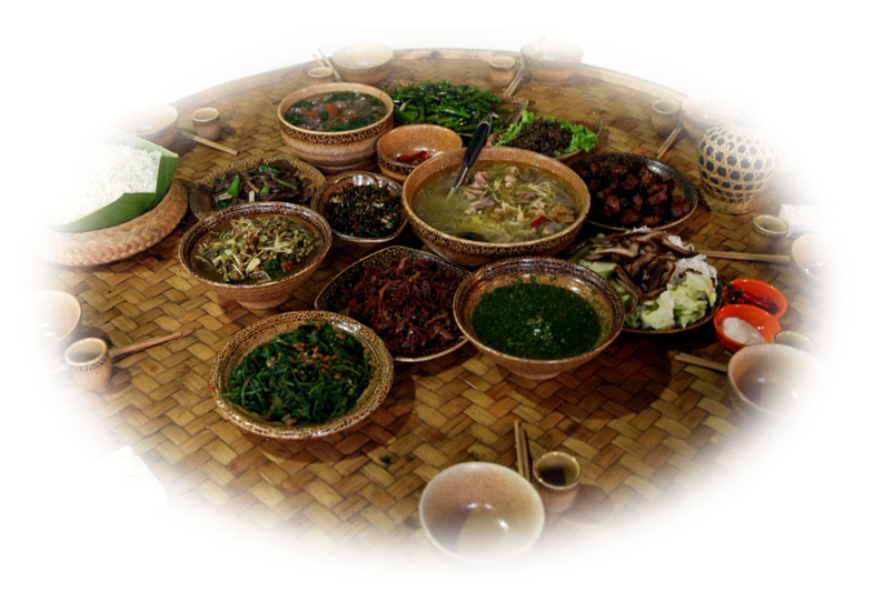 德昂族絕大多數(shù)以大米為主食,部分地區(qū)雜以包谷和薯類。均以蒸燜而食,擅長制作各種糧食制品,如:豌豆粉、豆腐、米粉、年糕、粑粑、湯圓等。蔬菜種類繁多,竹筍是四季不斷的蔬菜之一,除鮮吃外,多加工成酸筍或干筍食用。其他蔬菜的食用,都習慣于在煮燉時配酸筍,或加油、豆豉、鹽成雜熬菜。酸筍用途十分廣泛,即使在燉雞、炒肉或烹魚時都要加酸筍調味。受當?shù)貪h族的影響,許多漢族風味的腌菜、腐鹵也是德昂族餐桌上常見的小菜。德昂族民間制陶和使用竹編制品歷史悠久,所有炊餐用具,大都是自制的陶器和竹器。