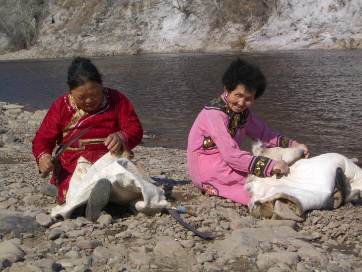 鄂倫春人過去在家庭公社“烏力鄰”里,同生產(chǎn)共消費,在當時生產(chǎn)力十分低下的情況下,憑著扎槍和弓箭,單個人很難獲得能夠滿足衣食需要的獵物,必須要有“烏力鄰”全體成員的通力合作,才能戰(zhàn)勝兇猛和龐大的野獸,所以,在“塔坦達”領(lǐng)導下的集體狩獵是當時最主要的勞動形式。隨著生產(chǎn)力的不斷發(fā)展和個體小家庭的大量流動,不僅社會組織“烏力鄰”由原來血緣性的家庭公社演變?yōu)榈鼐壭缘牡赜蚬?,勞動組織也隨之發(fā)生了極大的變化。集體狩獵已不再是“烏力鄰”傾巢出動,而是由幾個小家庭的成員自愿結(jié)合成“安嘎”來進行。同時還出現(xiàn)了集體和個人等多種勞動形式。狩獵也不再單純是為了滿足衣食的需要,剩余獵物可以拿去交換,獵產(chǎn)品已趨于商品化。故此時一些珍貴的細毛皮張和藥用價值較高的獸類,成了鄂倫春人主要的狩獵目標。這樣就形成了一年中的四個狩獵旺季,即:農(nóng)歷正月至2月是“鹿胎期”;4月至6月是“鹿茸期”;9月至落雪為“叫鹿尾期”;落雪后至來年開春是“打皮子期”。大概是源于原始的圍獵,鄂倫春人把狩獵叫“打圍”,而這四個狩獵旺季就叫“紅圍期”?!凹t圍期”除“叫鹿尾期”外,都組織“安嘎”集體出獵?!鞍哺隆笔且环N臨時性的狩獵組織,狩獵旺季將臨時,由一人發(fā)起,串聯(lián)幾位親朋好友或志趣相投的人組成一個“安嘎”,待獵期結(jié)束,“安嘎”自行解散,下次出獵時再重新組合,因此其成員并不是固定的(圖為熟化狍皮,吳雅芝攝影)。