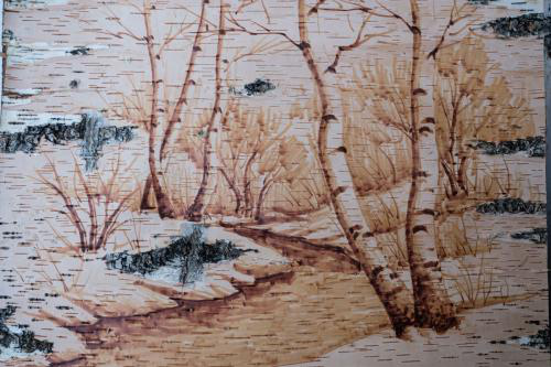 樺樹皮畫是樺樹皮工藝品中重要一種,它從簡(jiǎn)單適用的生活必需品中脫穎而出,成為滿族鄂倫春、鄂溫克、達(dá)斡爾、赫哲等北方狩獵民族精神文化特殊需求的用品。樺樹皮畫是用樺樹皮為繪畫材料,運(yùn)用樺樹皮天然形成的紋理、樹節(jié)為繪畫元素,利用獨(dú)特的繪畫工藝和技術(shù)繪制的以反映游獵民族社會(huì)生活為內(nèi)容,體現(xiàn)游獵民族思鄉(xiāng)情懷的工藝美術(shù)品。樺樹皮畫主要使用揭皮手法和碳化工藝來進(jìn)行創(chuàng)作,崇尚自然和環(huán)保理念。自然古樸、不可復(fù)制、裝飾性強(qiáng)和游獵民族的民族特性,是樺樹皮畫的幾個(gè)突出特點(diǎn)。