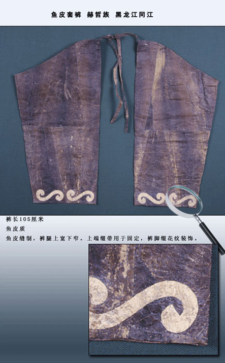 套褲的形式只是兩個筒形褲腿,沒有褲腰,男式的上端為齊口,女式的上端為斜口。赫哲族人稱男式魚皮套褲為 “臥又克衣”,褲邊口有皮條,是用來扎結(jié)用的。赫哲族人稱女式魚皮套褲為“嘎榮”,口呈月牙形狀,前邊到腰部,后邊到大腿根部。如圖所示,女式魚皮套褲,長105厘米,褲腿上寬下窄,上端系有綴帶,褲腳綴有“S”形紋飾。魚皮褲造型與普通褲子基本一致,褲腰和褲襠部較為寬松肥大,褲腿稍窄些。