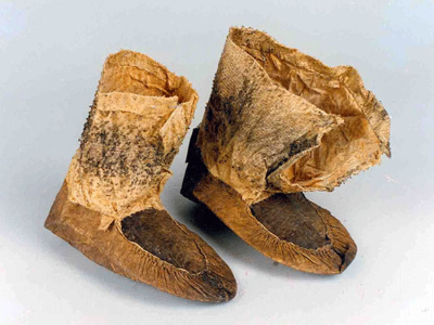 魚皮靴俗稱魚皮靰鞡,由魚皮四周整體向上折起,抽褶向上形成底部,前面與鞋臉縫制在一起,形成半圓形,鞋口再用另一塊魚皮縫上,形成圓筒形靴靿,然后穿繩或皮條做鞋帶。此鞋由身、臉、黝三部分組成。魚皮鞋既結(jié)實保暖,又抗寒防水防滑,適于在冰上和泥濘道路上行走及從事漁獵生產(chǎn)。如圖所示。