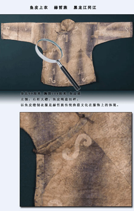 赫哲族的魚皮衣歷史久遠。我國古代文獻《山海經(jīng)》第九卷《海外東經(jīng)》中便有“玄股之國,在其(黑齒)北,其為人衣魚食鷗” 的記載?!耙卖~”西晉學者郭璞解釋為“以魚皮為衣也?!闭f明早在兩千多年前,赫哲族的先民就已使用魚皮做衣服了。另據(jù)密山新開流新石器時代遺址中出土的魚叉及骨針,證明赫哲族的先民捕魚和縫制魚皮衣有數(shù)千年歷史了。清代張晉彥的《寧古塔山水記》有:“魚皮部落,食魚為生,不種五谷,以魚皮為衣,暖如牛皮”的記載。《皇清職貢圖》記載:“赫哲衣服多用魚皮而緣以色布,邊綴銅鈴,亦與鎧甲相似?!绷硗?,地方志書對此也多有記載??梢?,赫哲族制作和穿著魚皮衣是真實而久遠的。