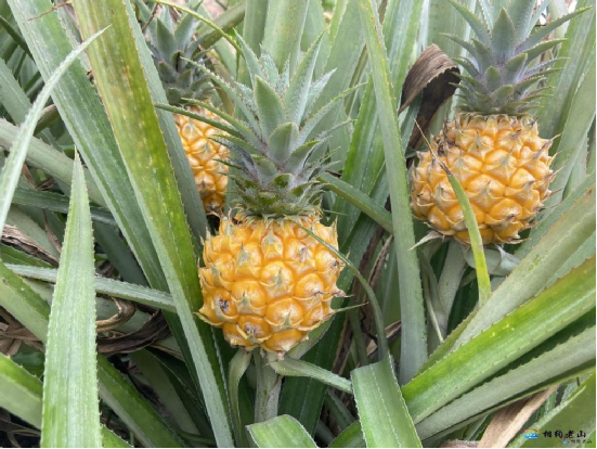 “我現(xiàn)在再砍去一些菠蘿的葉子,防止采收時(shí)割傷,同時(shí)讓太陽曬到菠蘿,讓菠蘿更好吃?!辈ぬ}地里,金黃的菠蘿隱藏在綠色的“皇冠”和葉片之下,馬停紅正在修剪菠蘿葉。