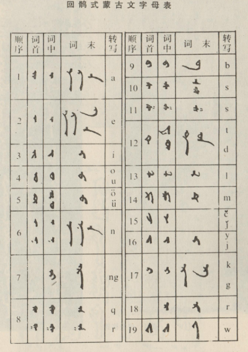 回鶻式蒙古文是一種拼音文字,字母分表示元音和表示輔音的兩大類。書寫時(shí)元音字母和輔音字母結(jié)合得很緊,筆畫連在一起,一氣呵成。最小的書寫單位是詞。但早期拼寫法不甚嚴(yán)密,有一個(gè)詞分做兩段書寫的情況。書寫格式是從上往下豎寫,從左往右移行?;佞X式蒙古文字母在詞首、詞中、詞末等不同位置上筆畫略有變化,以適應(yīng)連寫的需要。