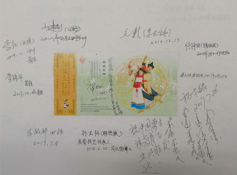 在采集口述影像錄音資料的同時(shí),項(xiàng)目組還收集了大量的珍貴歷史照片以及相關(guān)文物。值得一提的是,他們?cè)O(shè)計(jì)了一種非常有特色的受訪者簽名簿,中間貼著繪有56個(gè)民族的音樂(lè)舞蹈圖案的首日封或明信片,四周簽上受訪者的人名簽名字、民族特征,有些還用民族文字書寫,體現(xiàn)了中華各民族團(tuán)結(jié)在一起的精神風(fēng)貌。簽名簿有厚厚的幾大本,設(shè)計(jì)精美,承載著民族工作口述史資源采集的經(jīng)歷,具有豐富的文化內(nèi)涵和博物館收藏價(jià)值。