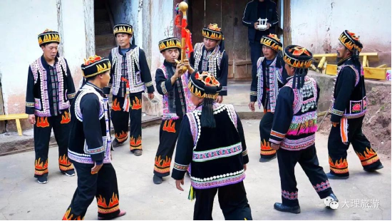 男子頭頂氈帽(又稱氈窩),穿大襟衣、大襠褲,赤足或穿草鞋,披羊皮,外出背皮袋(現(xiàn)已基本消失)。女子裹高包頭、額上飾銀桂花,衣為布襟,外套坎肩,腰系大圍腰,大圍腰左右下三邊繡五色花,為動(dòng)植物圖案,足穿繡花鳳頭鞋,用本地產(chǎn)綠布條制褲子,不鎖腳邊,腰間背圓形白氈裹背,所穿服飾顏色鮮艷、質(zhì)地厚重,盡顯遠(yuǎn)古南詔皇室服飾遺風(fēng)。