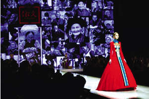 在活動(dòng)現(xiàn)場(chǎng),隨著一曲旋律優(yōu)美、委婉動(dòng)聽的布依歌謠《穿上阿媽的繡花衣》,4位布依族繡娘唱著古老的歌謠走進(jìn)秀場(chǎng)。她們安靜地坐在舞臺(tái)上飛針走線,以嫻熟的繡藝做起了日常的針線活。45套以中國(guó)刺繡元素為設(shè)計(jì)靈感的EVE CINA時(shí)裝、24套國(guó)金黃金股份有限公司專題設(shè)計(jì)的中國(guó)元素配飾逐一呈現(xiàn)在觀眾面前。秀場(chǎng)上演了一場(chǎng)東方時(shí)裝之美的視覺盛宴。