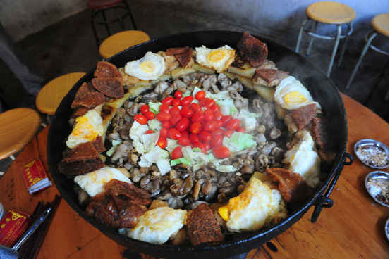 平壩凹鍋更具特色,食材十分豐富,為了拍攝平壩凹鍋小吃,我們一行來到當(dāng)?shù)厝俗诎l(fā)英家開的勤發(fā)飯店,并被安排在二樓的里間。屋內(nèi)正中支著一口平底銅鍋,下面是燒著炭火的爐子。火很旺,不一會平底鍋里的油便嗞嗞作響,主人把煎得黃黃的臭豆腐、豌豆粉等放到鍋里,鍋的中間加上一些蔬菜、小個西紅柿,色彩非常漂亮,周圍都放著一碗碗用噴香的辣椒面拌有濕蘸水和干蘸水。