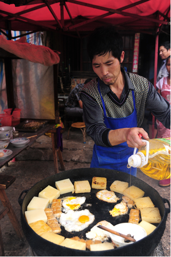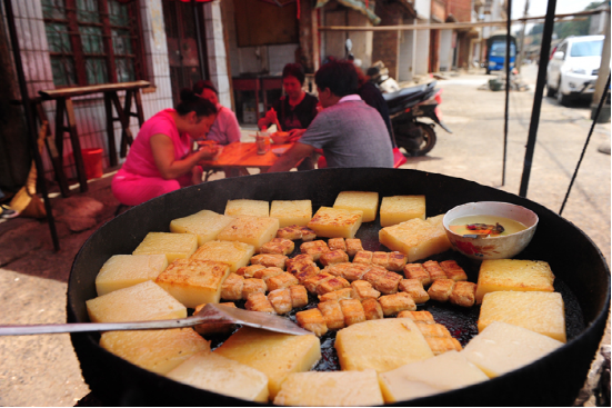 臭豆腐是平壩街的特產(chǎn),一直享譽滇東南。特別是在文山更是家喻戶曉。它火柴盒般大小,表皮長滿一層白白的絨毛。若是蒸吃,先揀幾塊鋪在碗底,再撒撮鹽巴,放點食油,加些姜絲,放進蒸鍋蒸熟。吃前用筷子攪和拌勻,看上去雪白,細嫩,宛若剛出籠的銀糕玉乳,散發(fā)出誘人的馨香。若用油煎,先將菜油舀進鍋里,待鍋熱時,立即放進臭豆腐。隨著“嗤”的一聲,香味立時撲鼻而來,再用小火耐心地將兩面煎黃,薄薄的黃皮內(nèi)含著一包乳漿??戳司妥屓舜瓜延巍?/p>