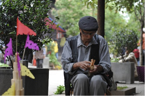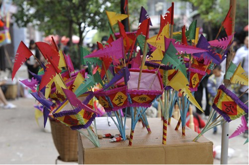 早上十點(diǎn)左右,火把就快扎好了。色彩鮮艷的紙裱斗升上各色卷著的彩旗正一個(gè)個(gè)被打開(kāi),梨、蘋(píng)果、花紅正被栓成一串串地掛在樹(shù)枝上,水泥桌上擺著小旗、炒蠶豆和糖果等,老人們?cè)谝慌赃呅吜模槐P(pán)彩色米干在燦爛的笑著。