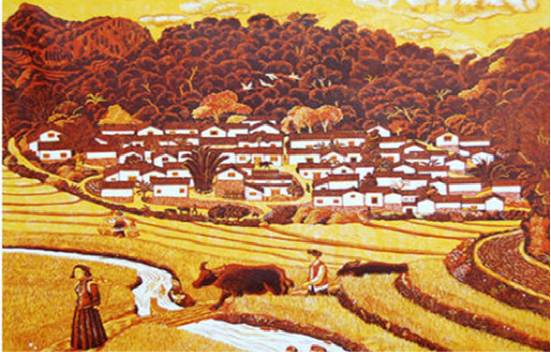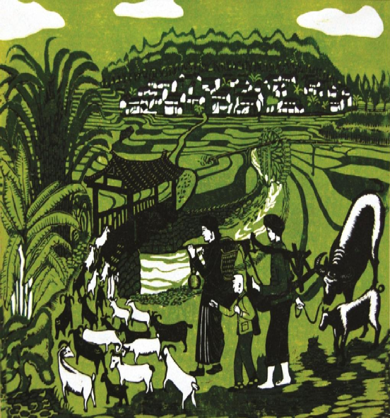 云南馬關(guān)壯族農(nóng)民版畫起源于馬關(guān)縣仁和鎮(zhèn)阿峨新寨村,“以刀代筆”是其主要的藝術(shù)形式,刀法粗獷、豪放而不乏細膩,具有濃郁的鄉(xiāng)土氣息和深厚的民族文化內(nèi)涵。