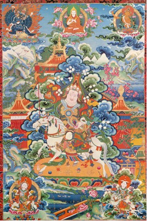 勉塘畫派是15世紀以后影響最大的繪畫流派,主要流行于衛(wèi)藏地區(qū)及昌都部分地區(qū)。該畫派的創(chuàng)始人是勉拉頓珠,他出生于洛扎勉塘(今山南地區(qū)),勉塘畫派由此而得名。他大約出生于公元十五世紀20年代或30年代。據(jù)史料記載,勉拉頓珠出生的時間正好與他家鄉(xiāng)發(fā)現(xiàn)了朱砂礦的時間一致。這種重要繪畫顏料的出現(xiàn),預示著一代繪畫大師降臨人世。他自幼聰慧,毫不費力地學完各種字體的書寫、大小五明中的絕大多數(shù)內(nèi)容。成年后,拜后藏一帶的著名美術大師多巴扎西杰布為師,苦心鉆研,在繪畫藝術領域取得了很深的造詣。通曉了藏、漢、印、尼泊爾等各種繪畫派別的技法,他根據(jù)《續(xù)部》等編寫了繪畫理論專著《造像量度如意寶》,并創(chuàng)立了勉塘畫派。他參與了一世達賴喇嘛根敦朱巴與1447年創(chuàng)建的扎什倫布寺措欽大殿壁畫繪制工程的全過程,單獨完成了北壁的《釋迦牟尼與十六羅漢圖》與《八十大成就者環(huán)圍金剛持》兩幅壁畫,在西壁勉拉頓珠親手繪制了《釋迦牟尼十二宏化圖》的白描部分。另外在該寺以及同時代建造的諸多廟宇繪制完成了大量的壁畫、巨幅堆秀唐卡及小型唐卡。其中最負盛名的是扎什倫布寺的巨幅堆秀唐卡《釋迦牟尼》,其大小約為長32.9米、 寬19.3米。該畫派造像法度精嚴,與傳統(tǒng)的表現(xiàn)手法相比,尤其注重線條的運用,線條工整流暢,色調(diào)活潑鮮亮,變化豐富,人物體態(tài)、骨相和肌膚都異常完美,脖頸較長,高度和諧的色彩和色調(diào)的配制十分突出。畫面暈染充分,用色細膩、柔和、富麗堂皇。由于石青和石綠色突出,從遠處看,繪畫作品十分優(yōu)美和靜。衣袍和飾帶呈不對稱形式,棋格使構圖消失,諸神位于云端風景之中,布局活躍多變,背光中卷草圖案等變成了波浪式放射的金線,該派擅長表現(xiàn)和靜類神像。