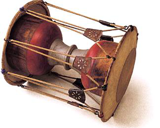 鼓框為木質(zhì),兩面蒙皮,用繩索固定在木框兩邊。鼓鏈木質(zhì),通常在表演中負責(zé)敲擊主要旋律的重拍,也有獨奏的情況,聲音有力。