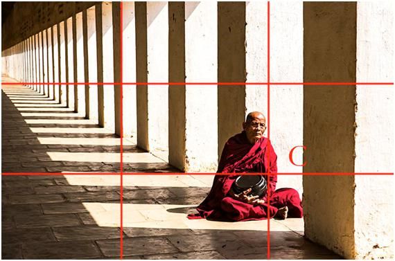 這三張圖都是就是黃金交叉點(diǎn)構(gòu)圖的應(yīng)用,第三張是在緬甸的拍的,當(dāng)時這個僧人坐在有光的長廊里,他的頭不在交叉點(diǎn)上,但落在相對差不多的位置。