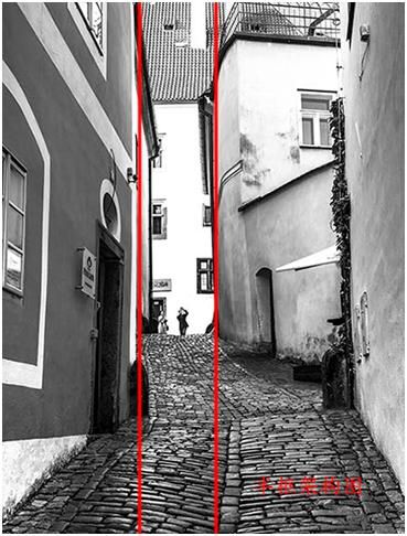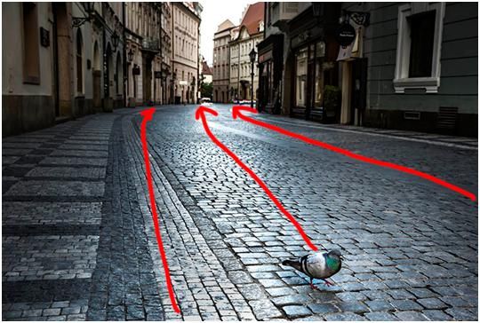 這張圖是布拉格阿的一個早晨,大概是早上五點(diǎn)多鐘,路上很安靜,天開始蒙蒙亮,我就拍了一張很安靜的街道,首先看到的興趣點(diǎn)是一只鴿子。路面形成的引導(dǎo)線以及通過路面反光形成的引導(dǎo)線來達(dá)到的,把目光從這只鴿子引向遠(yuǎn)方。