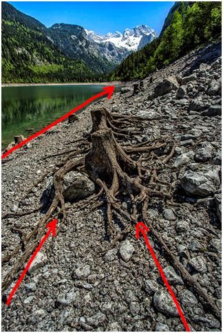 這個片子的興趣點(diǎn)是樹樁,樹樁根系和湖岸形成的引導(dǎo)線,把我們的目光從樹樁根系一直在往前推,一點(diǎn)點(diǎn)推到雪山,并不是跳躍性的看到雪山。觀者進(jìn)入畫面是一個逐步的過程,是一直有引導(dǎo)線引導(dǎo)著你,最后看向了遠(yuǎn)處的森林和雪山。