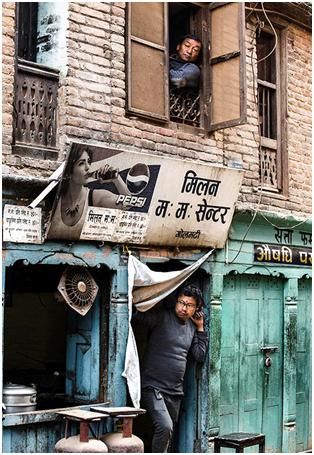 上面這兩張圖第一張,歸類為半包圍。第二張圖也是半包圍,在尼泊爾的一個小鎮(zhèn)拍的,旁邊兩個人是背影,實際上把這個人夾在中間,所以這個人特別容易引起你的注意,形成了一種包圍趨勢,在電影的鏡頭語言中運(yùn)用的比較多。