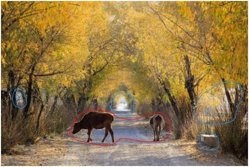 這幅片子用藍(lán)色部分標(biāo)注出來的地方,都是相對比較亮的有高光的地方,它們對照片中的主體(圈起的紅色部分),兩只牛形成了干擾,使得觀看者的目光不能集中在主體身上,總是被這幾個藍(lán)色高光部分所吸引。