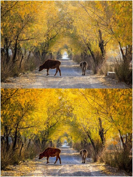 我們將遠(yuǎn)處部分的高光壓低,提亮了一下黃色的樹葉和地面的光照,加強(qiáng)了地面的陰影,這樣就有了一個比較通透明快的感覺,空間的縱深效果也有了加強(qiáng)。另外也稍微提亮了牛身上的亮度,但不能提的太亮,因為這樣的話會使片子的噪點(diǎn)比較大,同時也會失色。
