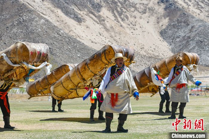 資料圖為西藏拉薩曲水縣俊巴漁村村民穿著盛裝表演牛皮船舞。 記者 貢嘎來松 攝