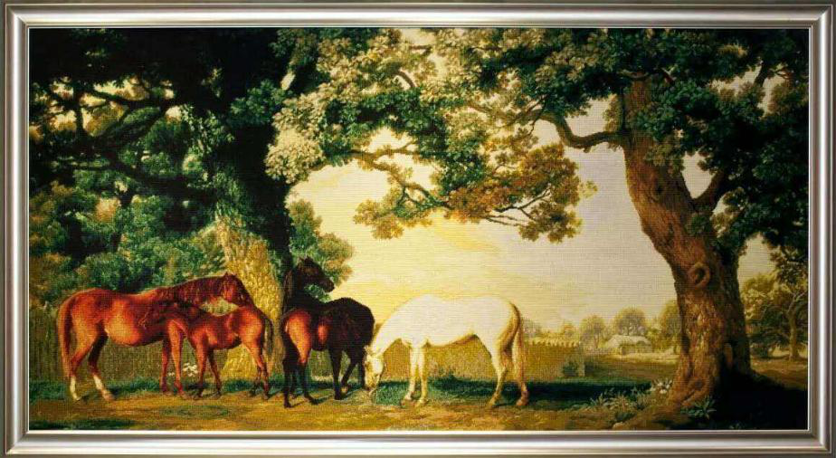 一般畫面較大,多數(shù)復制名畫、人物和風景照片。用線顏色往往達數(shù)百種,特別強調(diào)色階、色相的過渡,并注重人物神態(tài)的刻畫。作品常作為大型建筑的室內(nèi)裝飾。