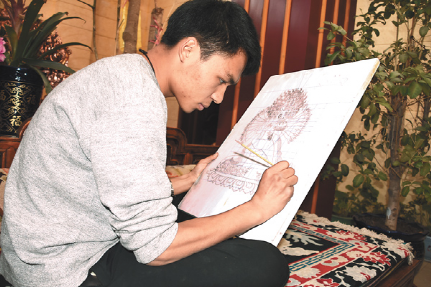 技藝上的登峰造極,次嘎把這一秘笈歸結(jié)成幾個(gè)平常的字眼:“興趣和堅(jiān)持”。從小受家族文化的熏陶,兩個(gè)兒子對(duì)傳統(tǒng)文化有著濃厚的興趣。薪火相傳也成了次嘎肩上的責(zé)任。20出頭的大兒子扎西拉達(dá)穿著白T恤,皮膚白皙、手指纖長(zhǎng)、陽(yáng)光帥氣,立志要子承父業(yè)?!案赣H告訴我即便是要做一名手工藝人,也不能放棄對(duì)文化知識(shí)的學(xué)習(xí),從小便把我送到內(nèi)地學(xué)習(xí)?,F(xiàn)在,我長(zhǎng)大了,該回來(lái)了?!?扎西拉達(dá)的話語(yǔ)堅(jiān)定。
