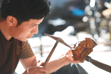 20歲前的次嘎已可以承接一些佛像的鍛敲任務(wù),掌握的技術(shù)遠(yuǎn)遠(yuǎn)超出一起學(xué)習(xí)的其他學(xué)徒們。從鍛敲佛像的蓮花底座、焊接,再到鍛敲銅佛造像上半身、下半身,再到慢慢地開(kāi)始做些佛像飾物。偶爾,次嘎也能涉獵造像的臉部。這是一個(gè)造像師手藝達(dá)到最好時(shí)才可以觸及的部位?!懊娌拷Y(jié)構(gòu)復(fù)雜又微妙,面部表情的刻畫(huà)更是難上加難。作為一個(gè)造像師,這是最考驗(yàn)功力的地方,每一次敲打都在決定作品的成敗?!贝胃抡f(shuō)道。