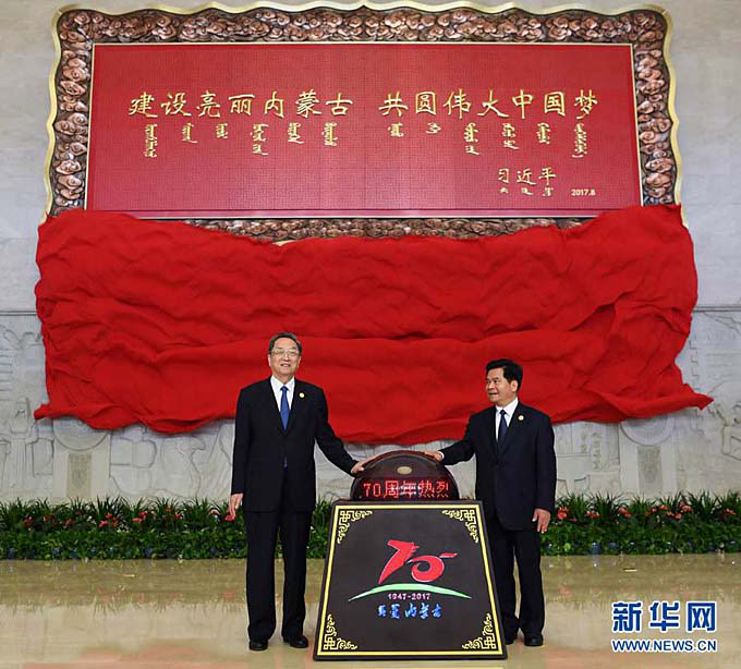 70年來,在黨中央高度重視、關(guān)心關(guān)懷下,內(nèi)蒙古各族人民在革命、建設和改革的各個歷史時期,創(chuàng)造了一個又一個人間奇跡,萬里草原發(fā)生了翻天覆地的歷史巨變。圖為8月7日,中共中央政治局常委、全國政協(xié)主席、中央代表團團長俞正聲率中央代表團出席向內(nèi)蒙古自治區(qū)贈送紀念品儀式,俞正聲和內(nèi)蒙古自治區(qū)黨委書記、人大常委會主任李紀恒一同為習近平總書記題詞賀匾揭幕(新華網(wǎng))