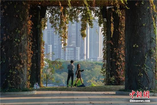 2021年11月30日,廣西南寧五象湖公園,市民趁著好天氣前來欣賞都市美景。中新社記者 陳冠言 攝