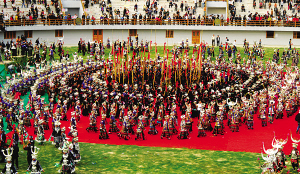 貴州省黔東南苗族侗族自治州雷山縣作為中國苗族歷史上大遷徙的集結(jié)地和中國苗族文化中心,以厚重獨特的文化,包括苗年在內(nèi)的11項文化遺產(chǎn)登上了中國非物質(zhì)文化遺產(chǎn)的殿堂。苗年是苗族一年中最重要的祭祀傳統(tǒng)節(jié)日,是苗家人的一大盛事,每年都有來自全國乃至全世界的游客到雷山參加苗年活動。圖為紅火熱鬧的苗年歡慶場面。