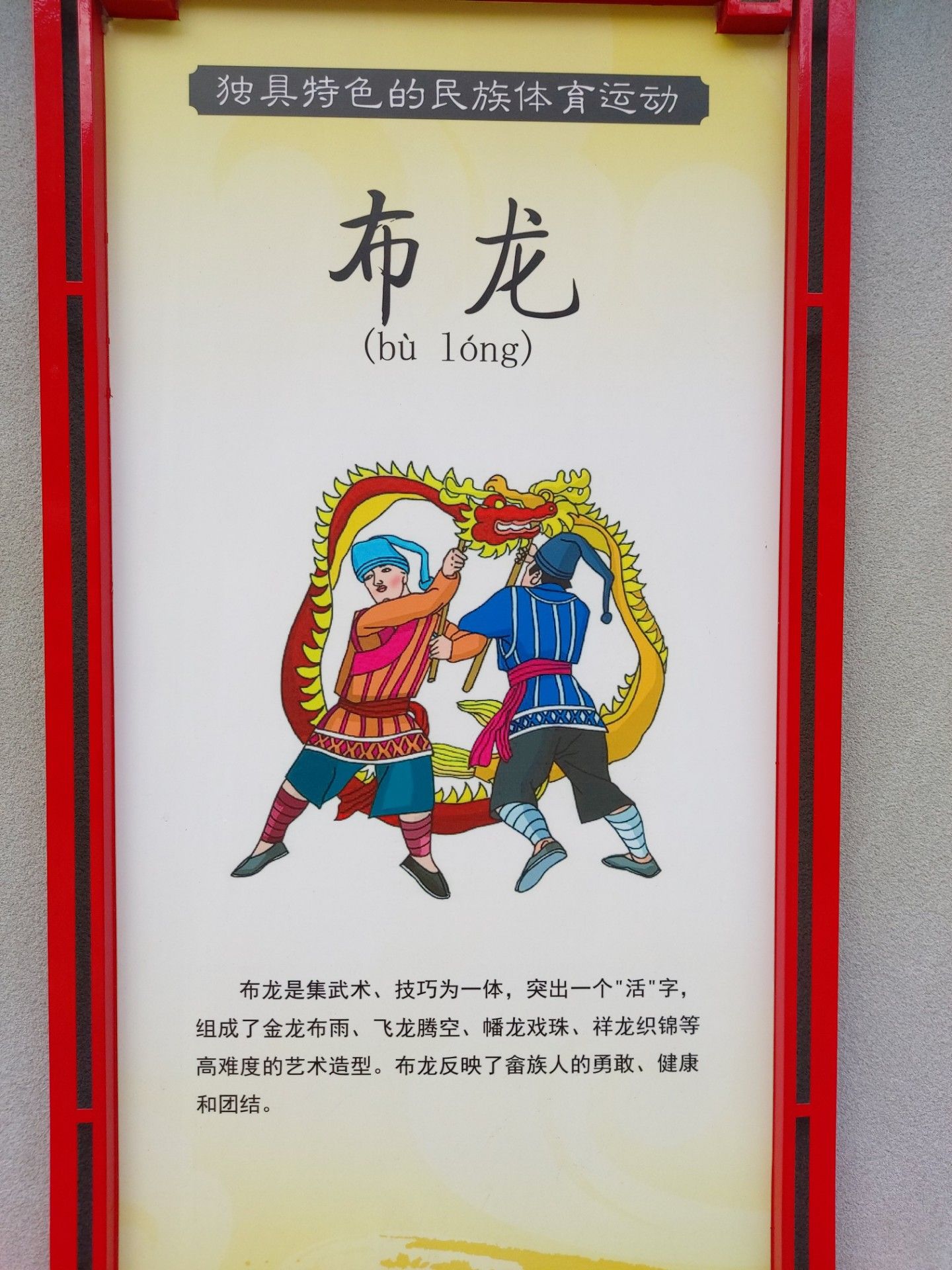 布龍是集武術(shù)、技巧為一體,突出一一個(gè)"活"字,組成了金龍布雨、飛龍騰空、幡龍戲珠、祥龍織錦等高難度的藝術(shù)造型。布龍反映了畬族人的勇敢、健康和團(tuán)結(jié)。