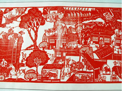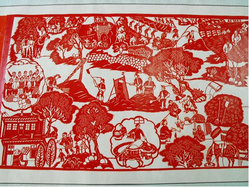 2、達(dá)拉特紀(jì)事剪紙的歷史價值很高,《農(nóng)民紀(jì)事圖》上卷記載了從建國到現(xiàn)在農(nóng)村的發(fā)展變化,在作品中我們看到了很多瀕臨失傳的農(nóng)村生產(chǎn)生活工具和生產(chǎn)方法,也能看到黨和國家在每一年出臺的各項惠農(nóng)利民政策,對于研究歷史具有重大的文獻(xiàn)價值。
