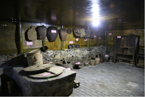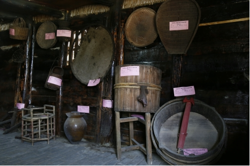 “農(nóng)耕文化陳列館”是由兩棟傳統(tǒng)的木質(zhì)民房改建,從大門(mén)進(jìn)來(lái),門(mén)的兩邊放置有農(nóng)具,右側(cè)一個(gè)是存儲(chǔ)糧食的倉(cāng)庫(kù),沿著倉(cāng)庫(kù)邊上的石階往上走,從小門(mén)進(jìn)去,大大小小的簸箕、飯甑、貓籮、魚(yú)籮等農(nóng)具應(yīng)有盡有。