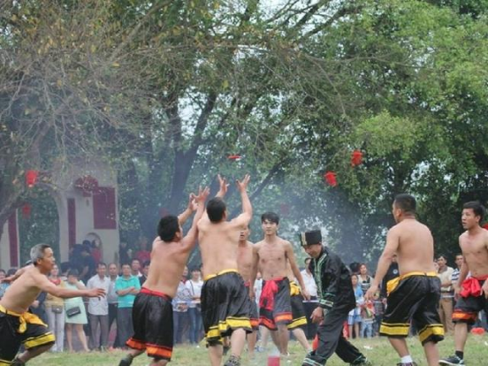 打榔舞,是崇左市天等縣的壯族傳統(tǒng)民俗舞蹈,用于酬神、還愿、祭祀、娛樂等活動,起源于唐代武德年間。打榔舞主要道具為木榔,音樂響起后,每人用一米多長的木杵有節(jié)奏的敲擊榔壁、榔底和榔邊,動作歡快有力,以此來表達(dá)壯族人民對五谷豐登、六畜興旺、幸福吉祥的祈求和渴望。表演者不分男女老少,有二人對打、四人對打、多人交錯對打等多種方式。