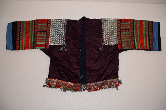 分布在凱里、雷山、丹寨、麻江四縣交界地一帶苗族村寨,以凱里舟溪苗族為代表。該服裝上衣為緞面對襟衣,刺繡主要在肩袖及袖口部分,以黔東南苗族特有的繭片繡為主,所繡圖案為浮萍花和幾何紋,肩部和背部鑲有銀泡和銀片,具有民族特點 。前、后圍腰片均以繭片繡為主,所繡圖案為浮萍花和幾何紋。
